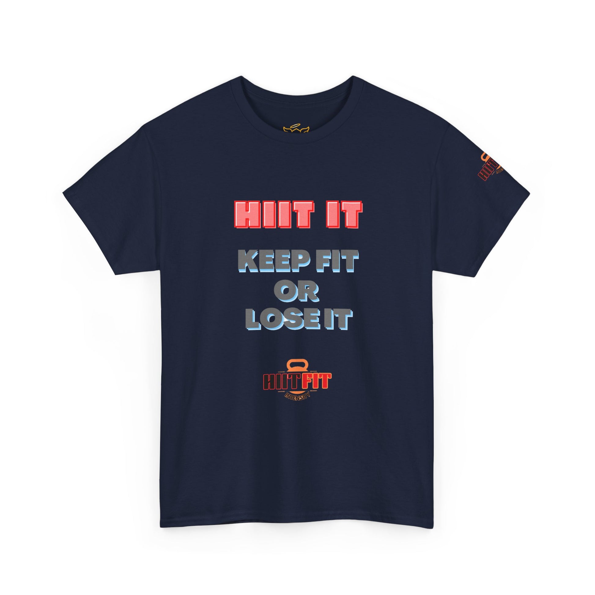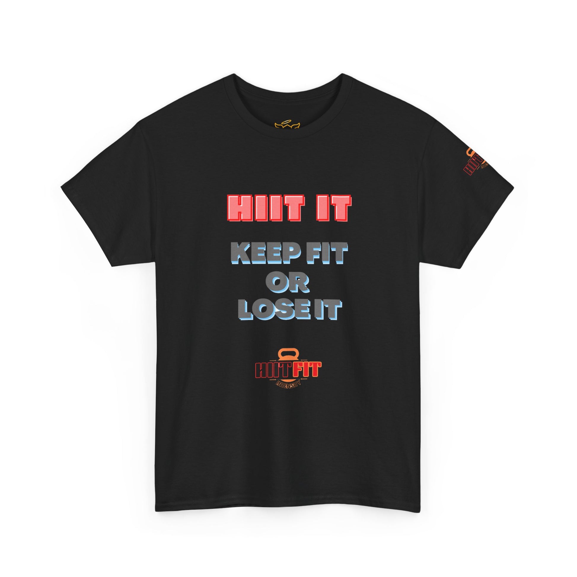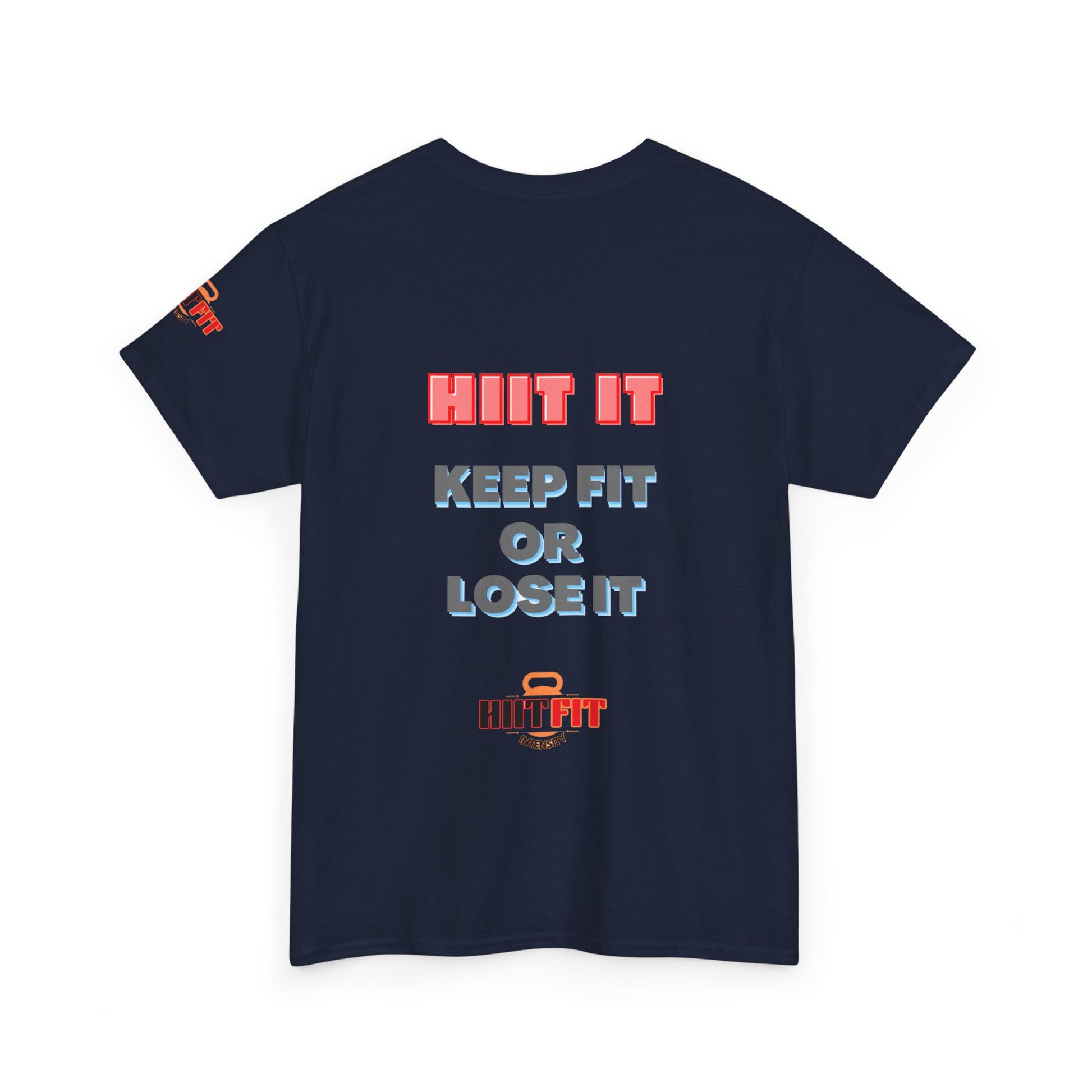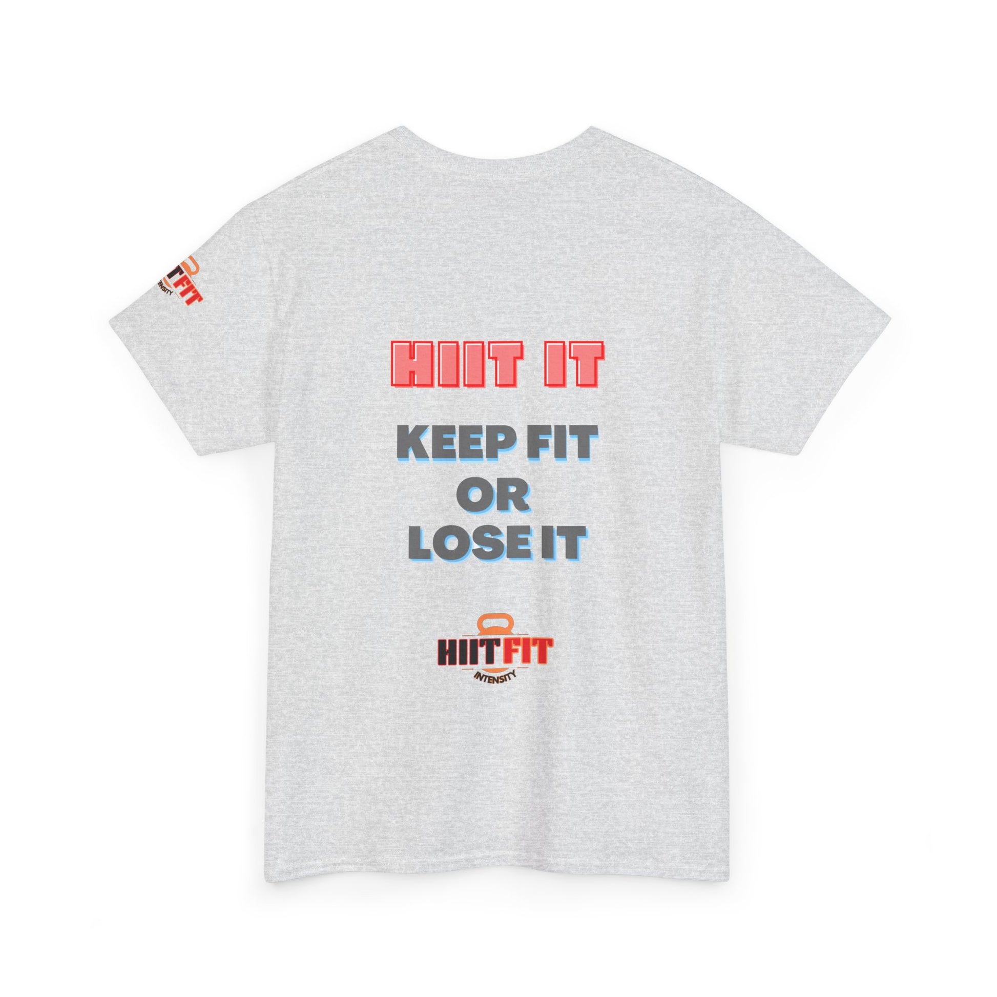 This HIIT fitness quotes tee features the phrase 'KEEP FIT OR LOSE IT', motivating you to stay active and fit. Made of heavy cotton, this tee is durable and comfortable, perfect for daily workouts or casual wear. Ideal for fitness enthusiasts and those who prioritize a healthy lifestyle. Great for holidays like New Year's resolutions, and perfect for gym-goers and athletes.